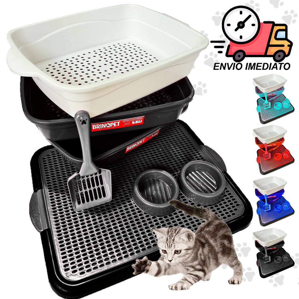 Kit Sanitário Higiênico Completo 3 em 1 Bandeja Caixa de Areia Comedouro Bebedouro Pá Gatos Felinos