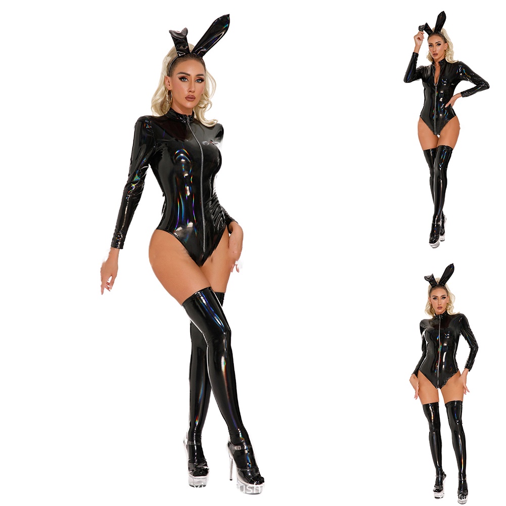 Fato De Couro PU Com Zíper Em Látex Brilhante Conjunto De Meias Aspecto Molhado
