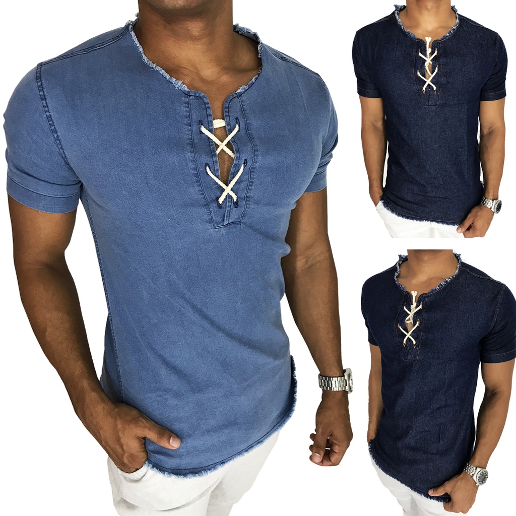 Camisa jeans manga curta social masculina slim gola cordão longline