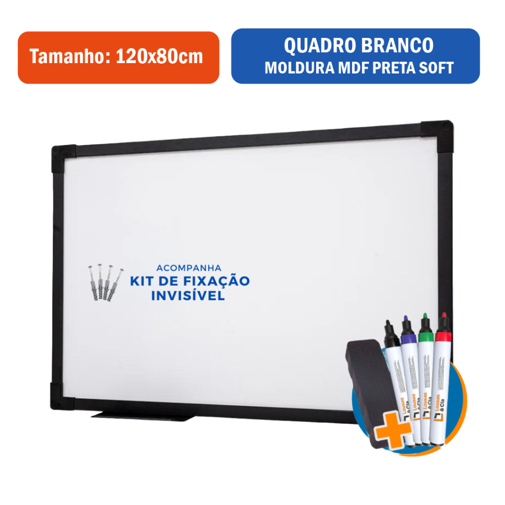 Quadro Branco 120x80cm Lousa Branca UV Moldura MDF Preto Soft + 4 Canetas + 1 Apagador