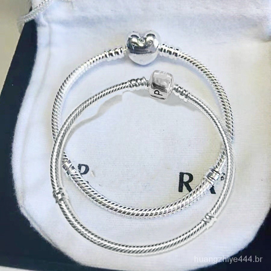 Pulseira Clássica Prata 925 Sterling Silver, com bolsa de veludo, pode ser usada para Charm DIY Pulseira em forma de coração, Hipoalergênica simples