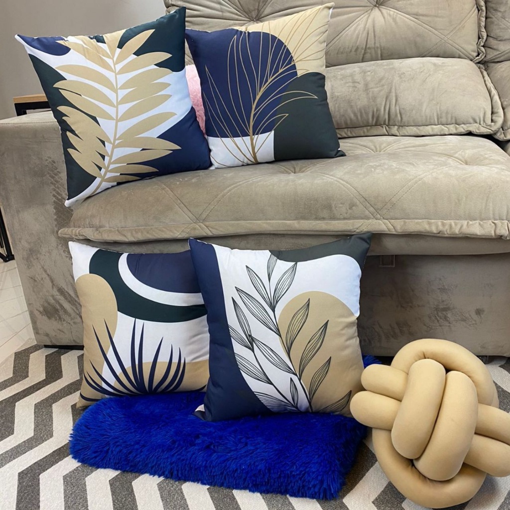 Kit 04 Almofada Cheias Decorativa Estampa Modern Print Luxo Abstrato Folhas Azul e Bege