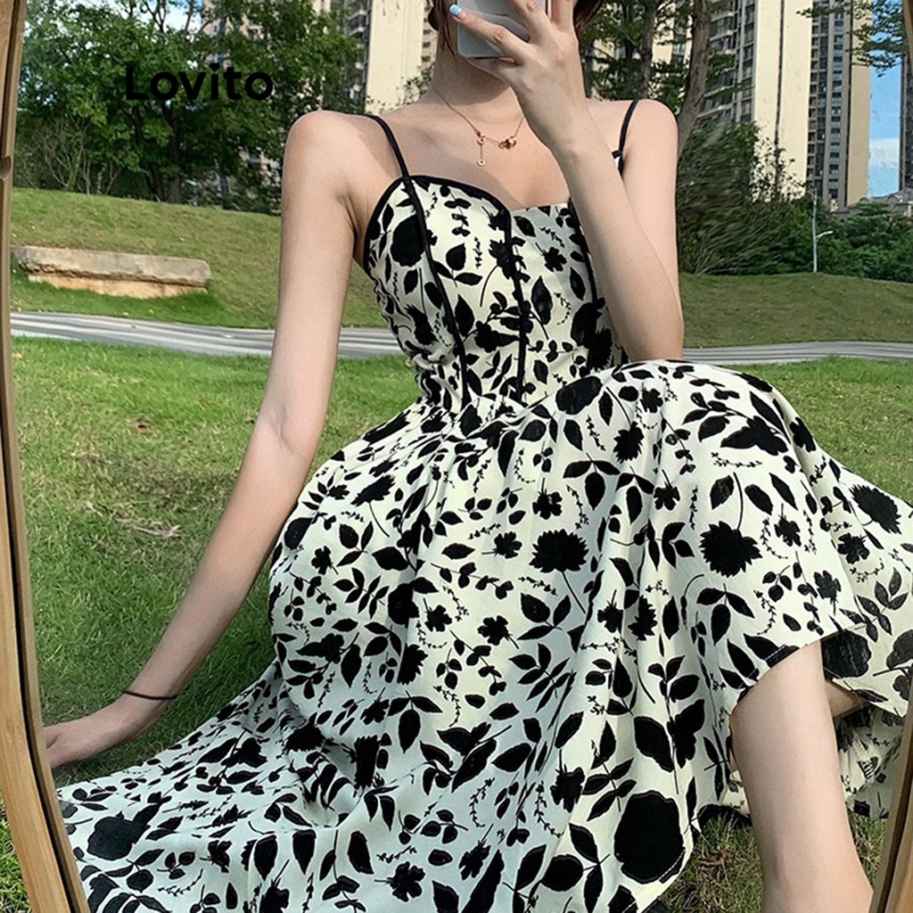 Lovito Casual Vestido Feminino Floral Midi Skatista Sem Mangas com Zíper e Decote Quadrado LNA11055 (Preto)