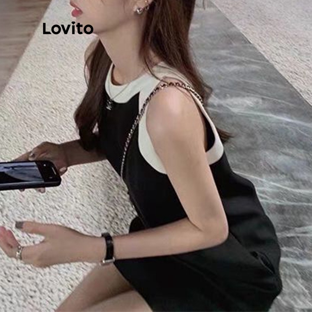 Lovito Casual Vestido Feminino Mini Liso Sem Mangas Evasê com Gola Redonda e Costura Contrastante LNE02212 (Preto)