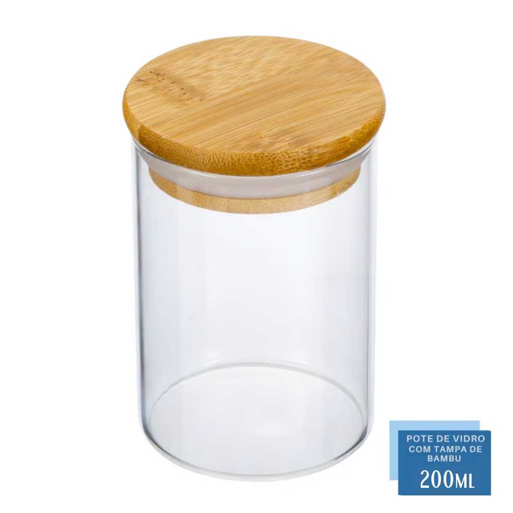 Pote Hermético De Vidro Com Tampa Bambu 200ml Porta Mantimentos Alimentos