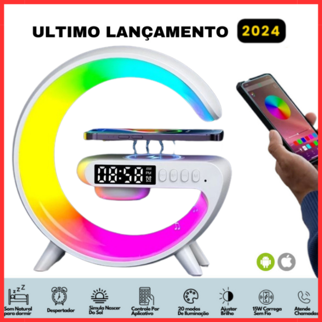 Caixa De Som G-Speaker Luminária Bluetooth Inteligente Relógio Carregador Sem Fio Led Luz Rgb
