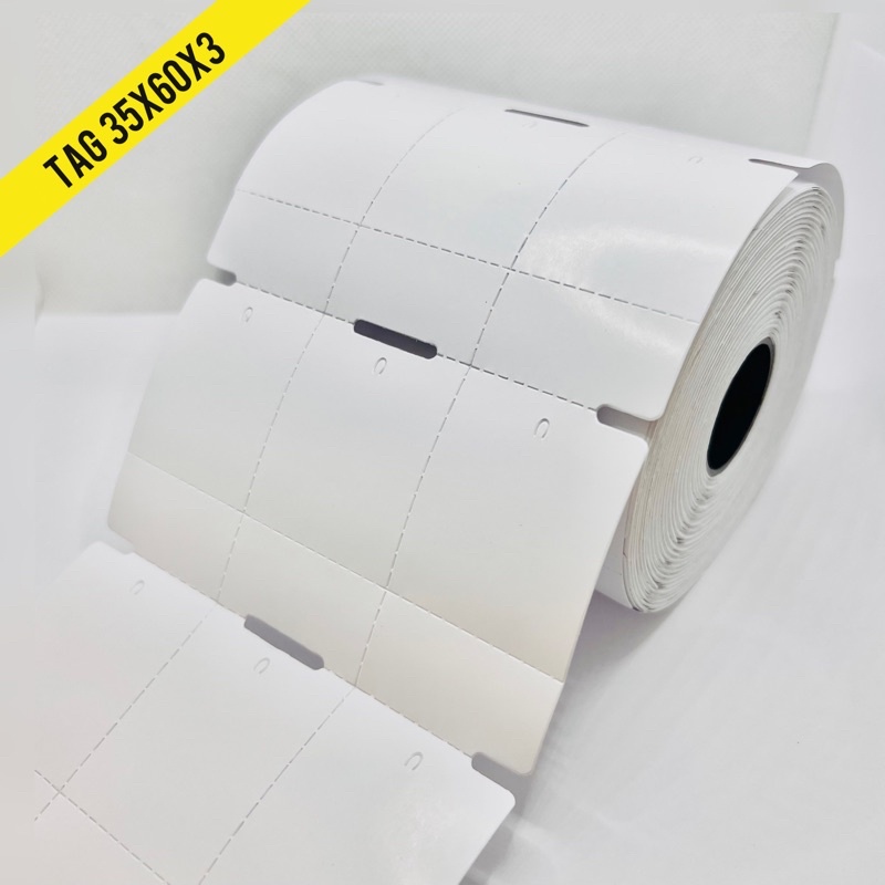 Tag 35x60x3 couchê com picote/sem picote (3 colunas) cartão para Zebra, zetex, Argox,Elgin e etc.- Rolo com 1500 (30m)