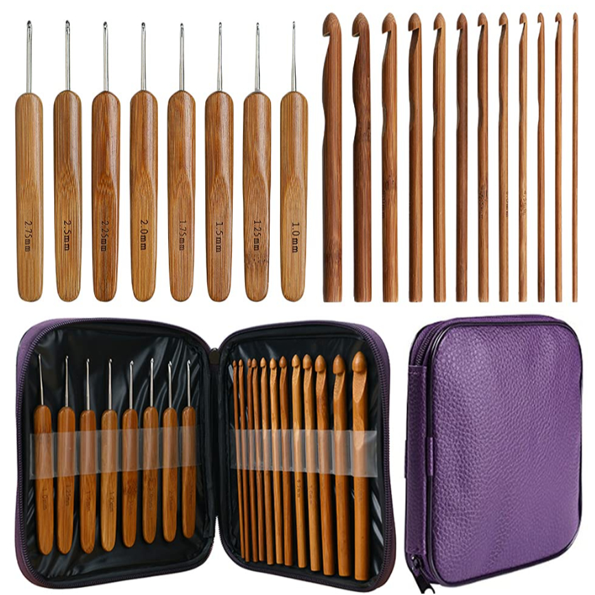 Kit Com 20 Agulhas Para Croche Cabo De Bambu + Estojo