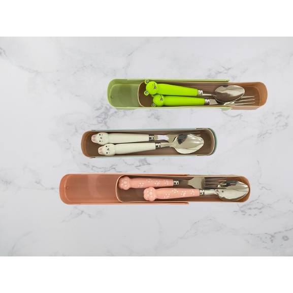 Conjunto Talher Animais inox Colher ,Garfo e faca Infantil de Gatinho cabo de plástico acompanha estojo para armazenar os talheres