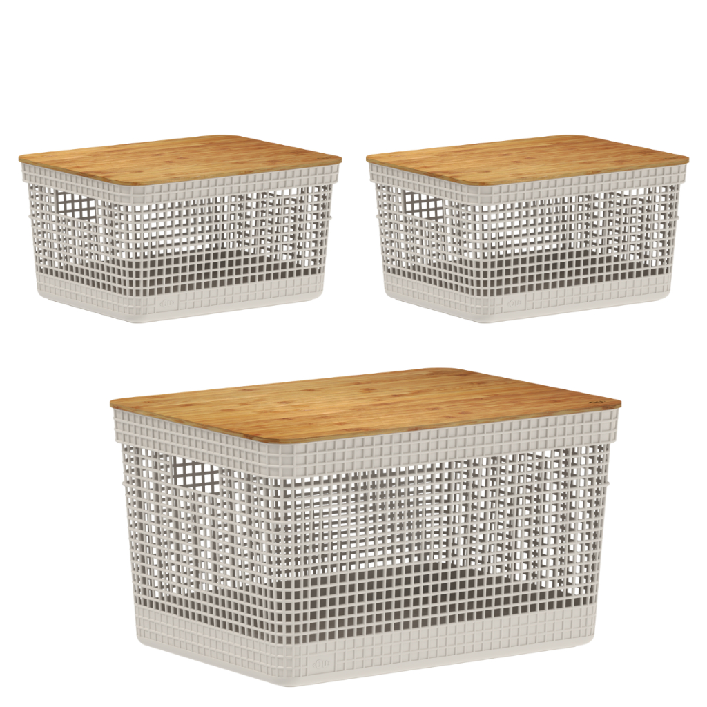 Kit Conjunto Com 3 Cestos Organizadores Grid Com Tampa De Bambu 1 de 20 Litros 2 de 8l Ou