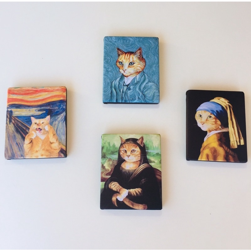 kit 4 quadros decorativos gatinhos monalisa, van gogh, o grito e moça com brinco de pérolas obras de artes famosas tela acetinada