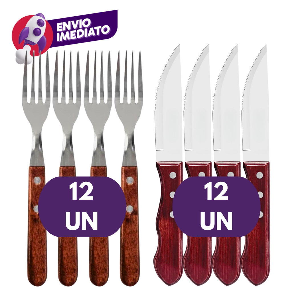 Kit Talher Faca Jumbo Outback E Garfo Mesa Jogo Inox Com Cabo Madeira Conjunto Wooden C/12 Ou 24 Un