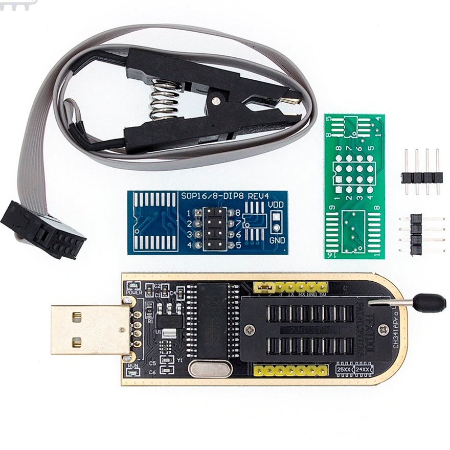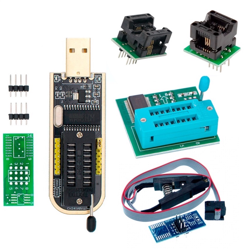 Kit Gravadora USB de Bios Eprom CH341A Serie 24 25 + Adaptador de Voltagem 1.8v + Pinça Clip Garra Jacaré SOIC 8