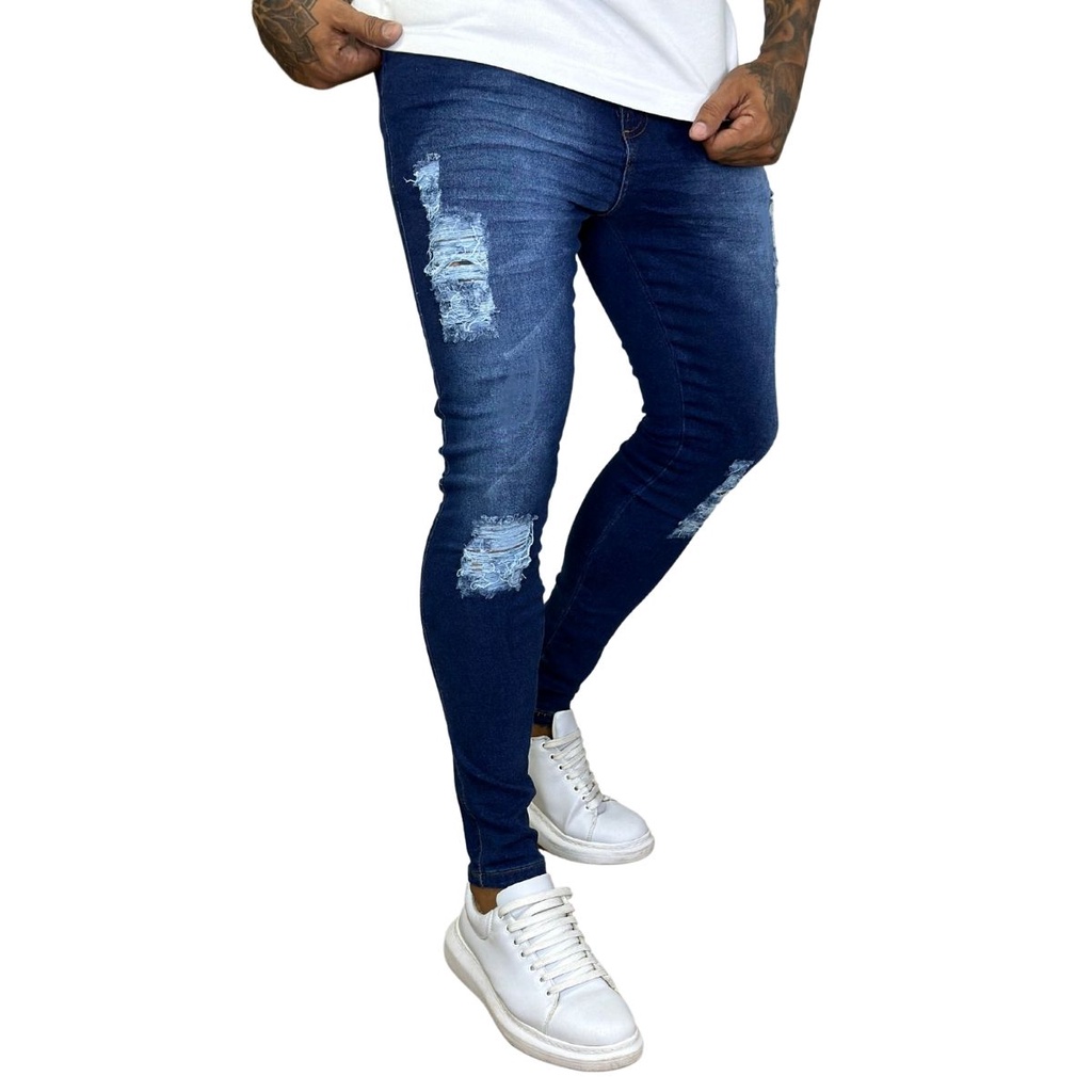 Calça Super Skinny Masculina Rasgada Destroyed Jeans Com Lycra