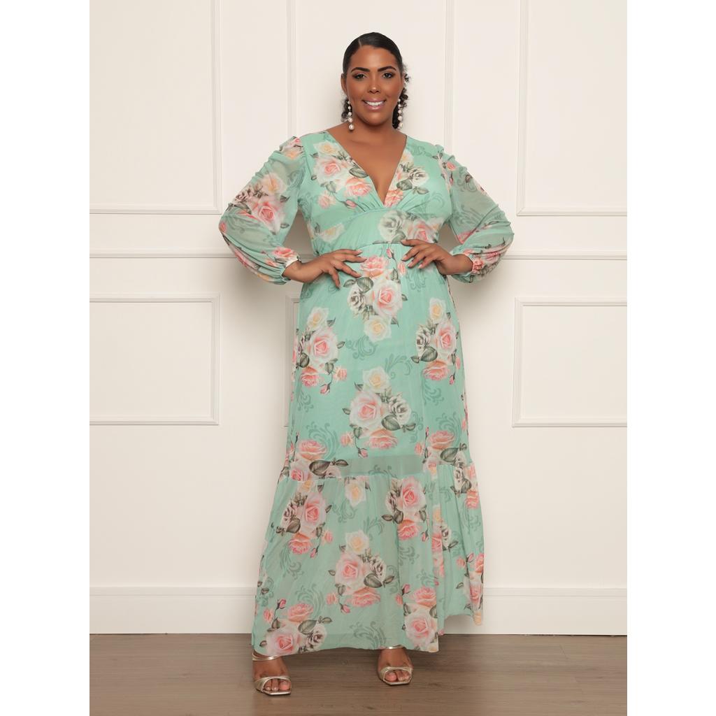 Vestido Longo Plus Size, Manga Longa Bufante Aberta Ps87
