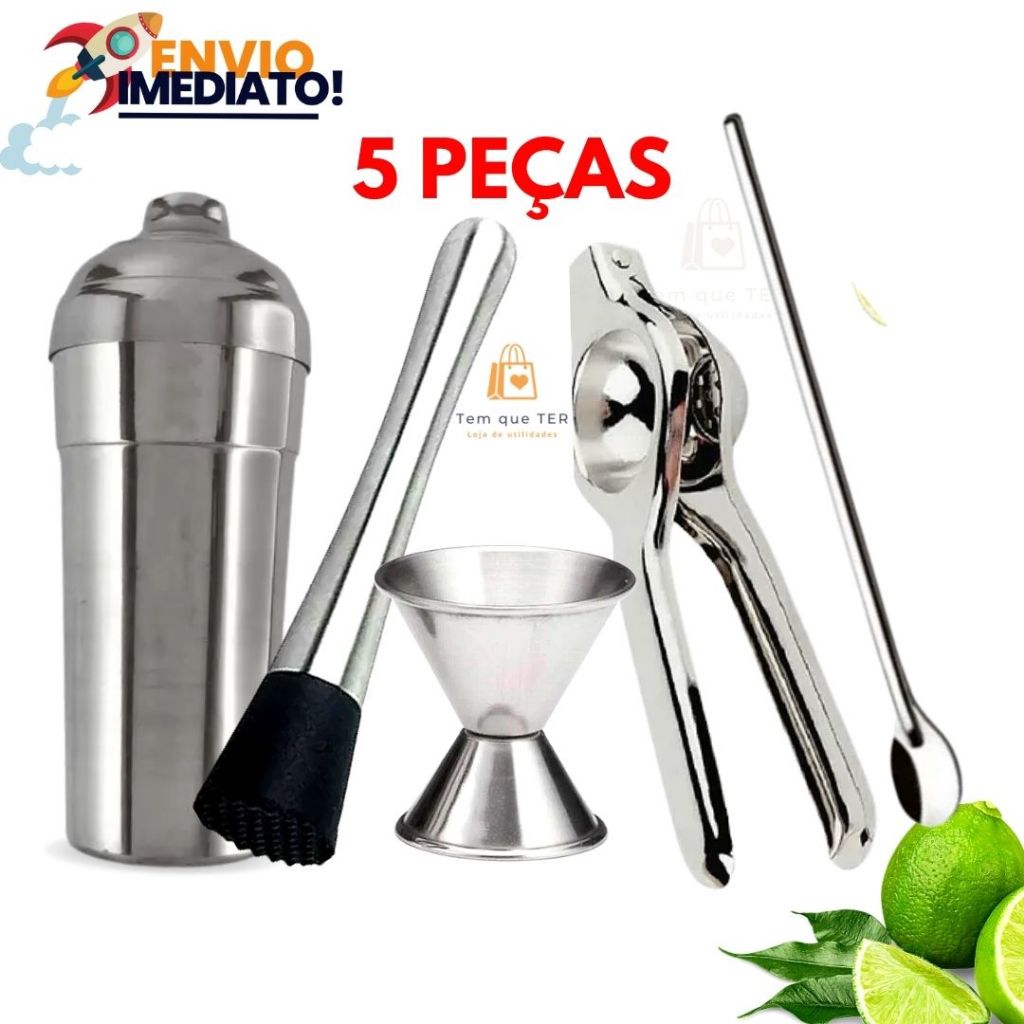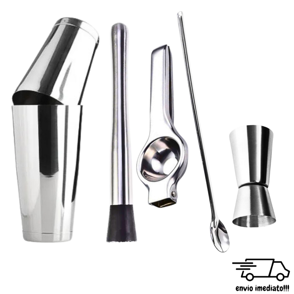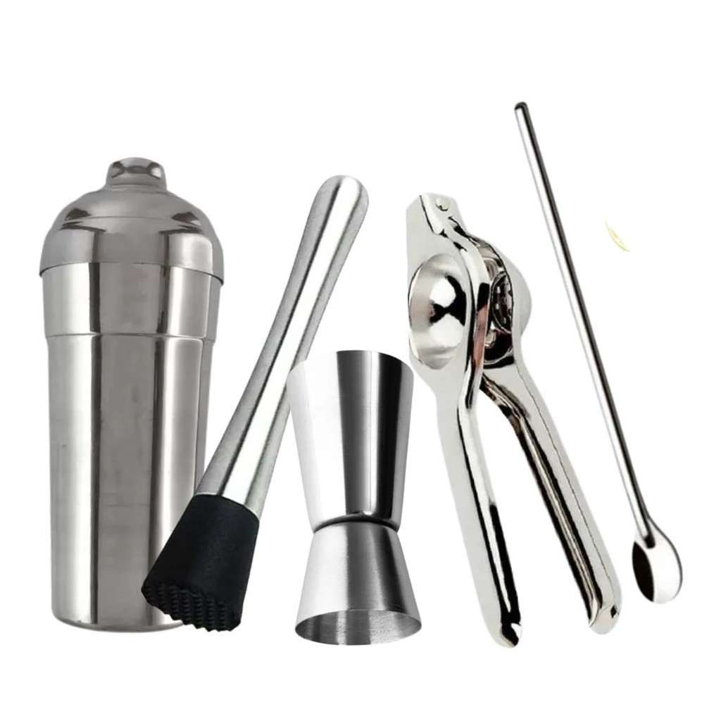 Kit 5 peças Coqueteleira Inox Boston 820 ml + Socador + Espremedor de Limão + Colher Bailarina + Dosador de Bebidas