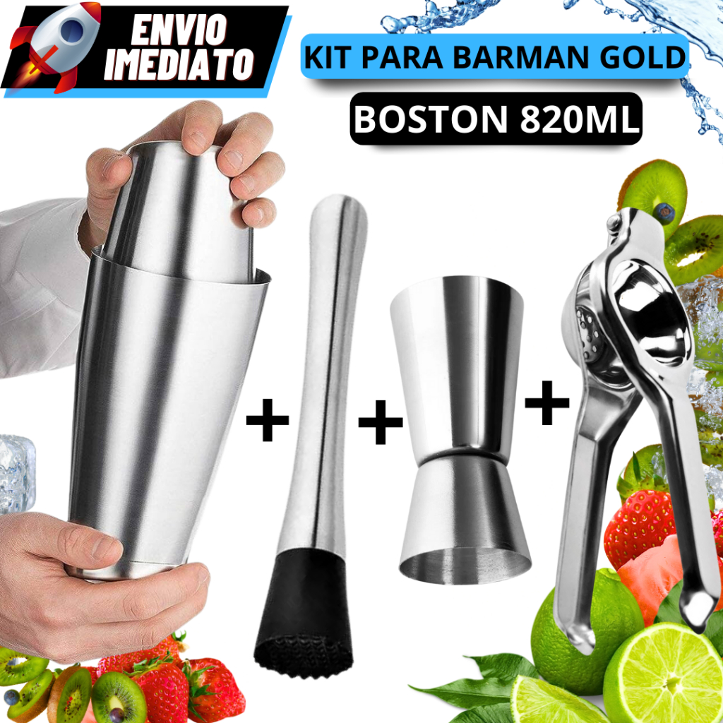 Kit Gold Para Barman Coqueteleira Boston 820Ml Dosador Duplo 50/25ml Espremedor de Limão e Socador de Gelo Inox Para Drinks Bares Barman Coqueteira