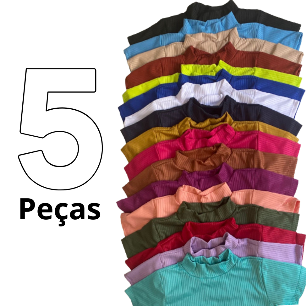 Kit 5 Blusas Canelado Feminina Gola Alta Blusinha Manga Curta Modinha