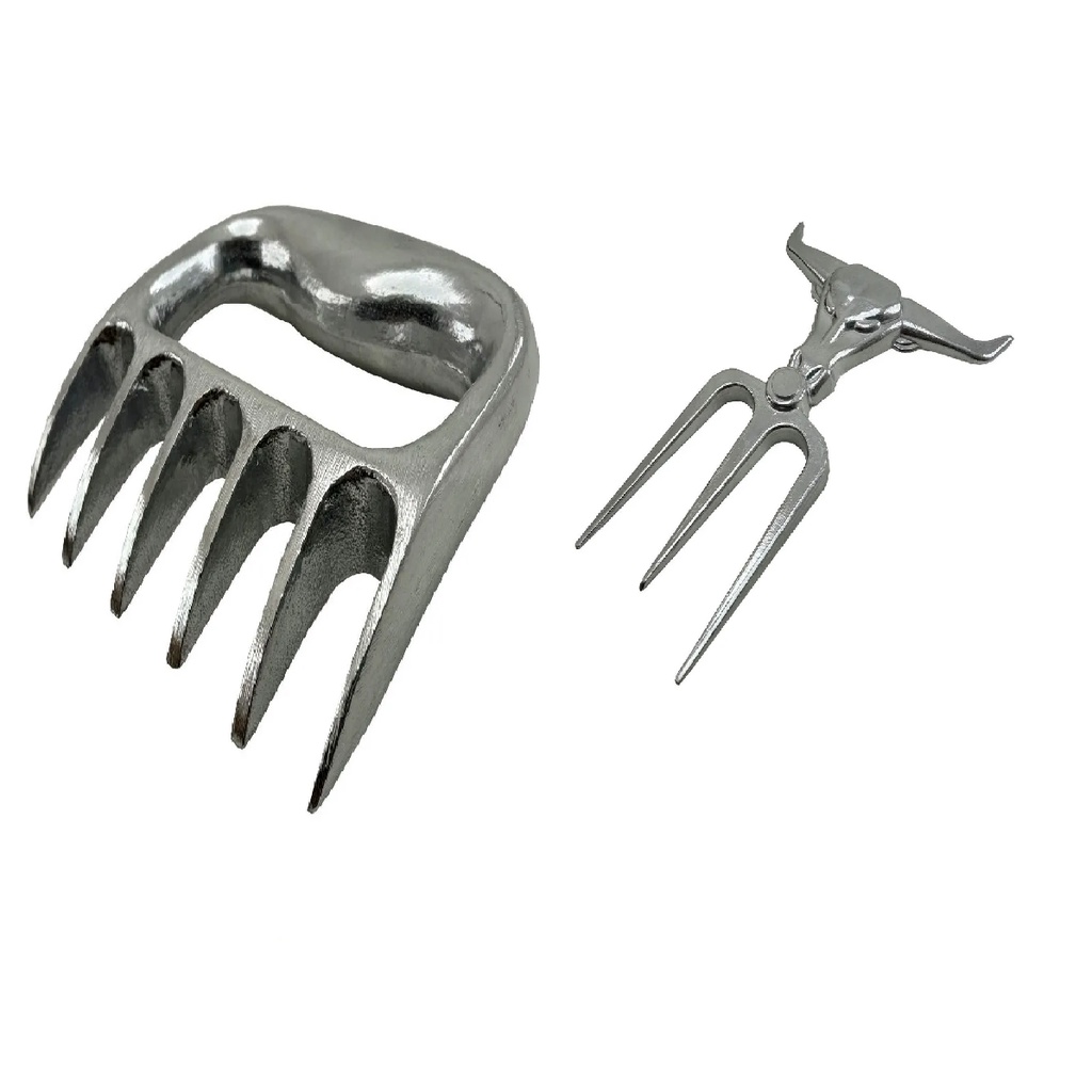 kit churrasco garfo tridente e garra de urso para churrasco cortar e desfia carnes em alumínio batido 2 peças