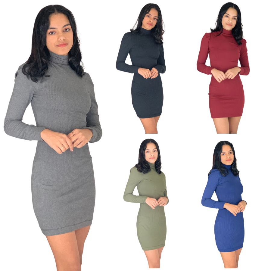 Vestido Feminino Gola Alta Manga Longa Curto Malha Suplex 055