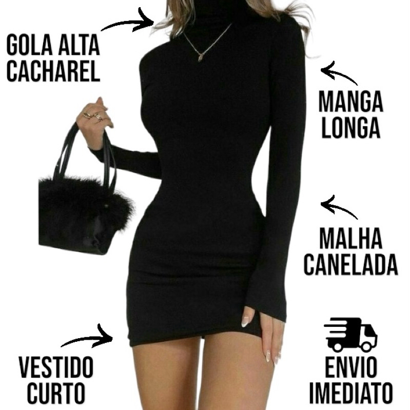 Vestido Feminino Gola Alta Manga Longa Curto Malha Suplex