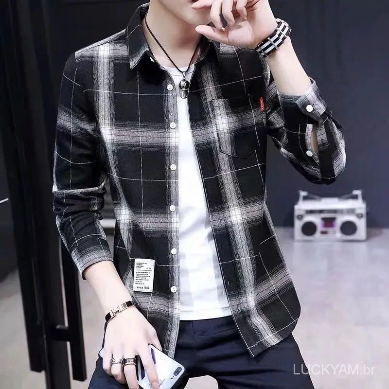 Camisa xadrez para homens de primavera e outono de mangas compridas, moda coreana, roupas personalizadas, camisa de estilo acadêmico, jaqueta fina, camisa casual