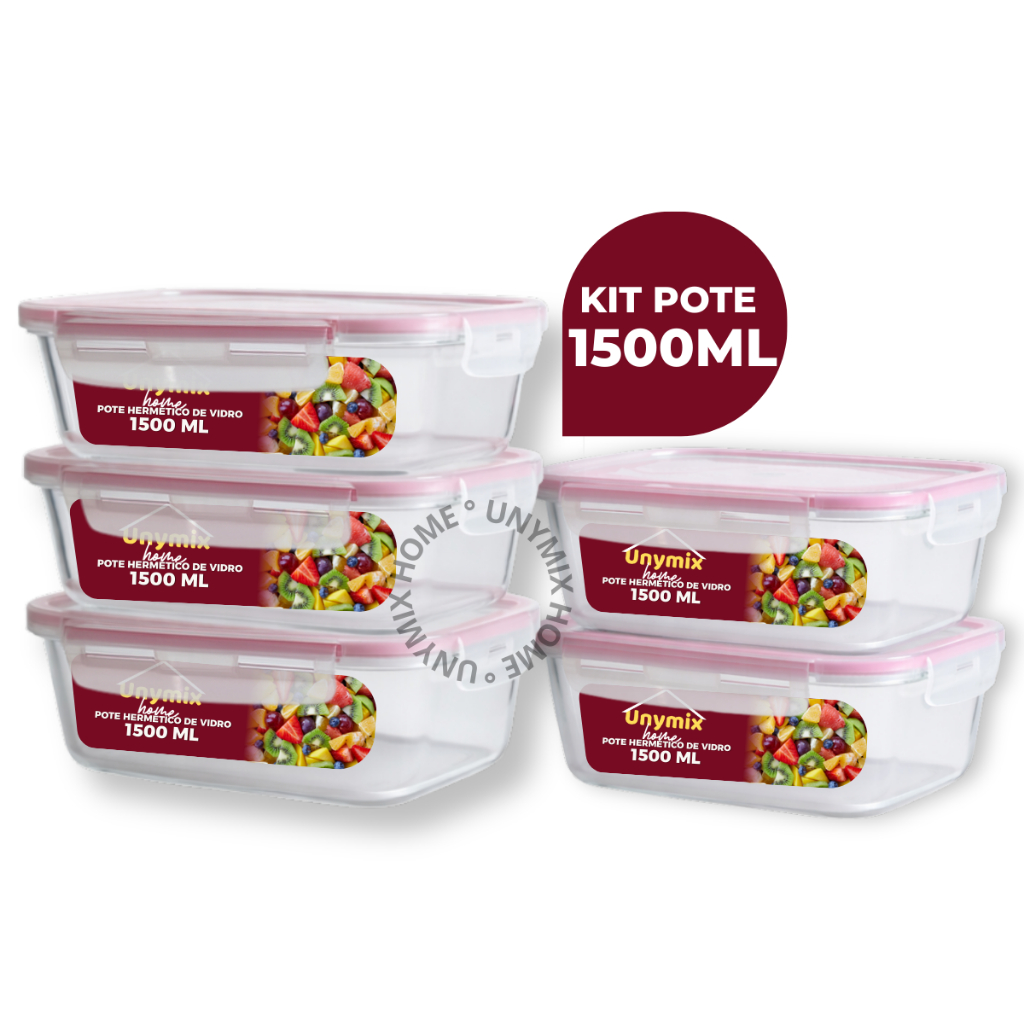 Kit 5 ou 2 Potes Vidro Herméticos 1500ml Retangular Vidro Hermético 4 Travas Premium
