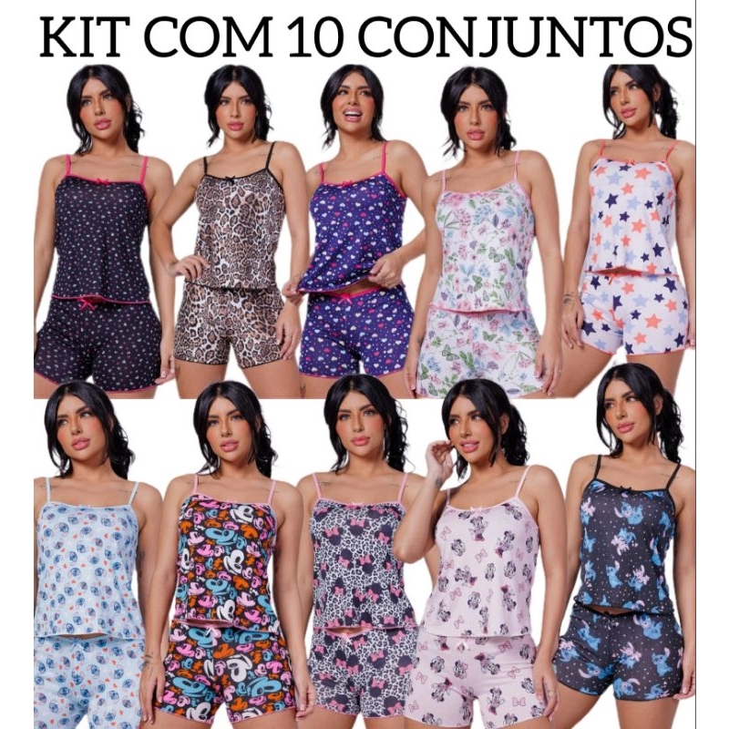Kit 10 Conjuntos Pijama Baby Doll Adulto Feminino Estampado Feminino H2 Shop