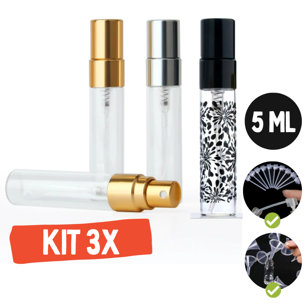 3X Porta Perfume 5ml Frasco Spray Vidro Kit Bico Decanter e Mini Funil Recarregável Portátil Viagem