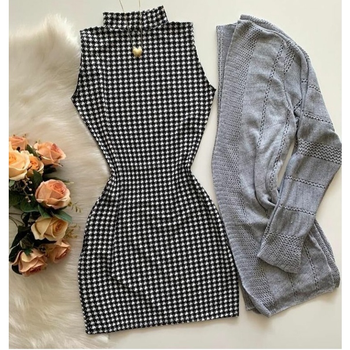 Vestido Feminino Regata Pied de Poule Curta Gola Alta