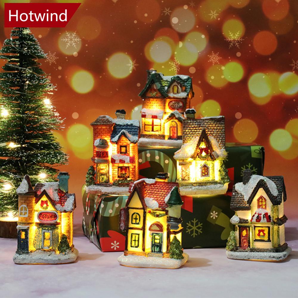 HOTWIND Natal Luz LED Ornamentos Resina Mini Casa Miniatura Edifício Vila Xmas Glow Decoração Presente De Navidad Noel H7Y2