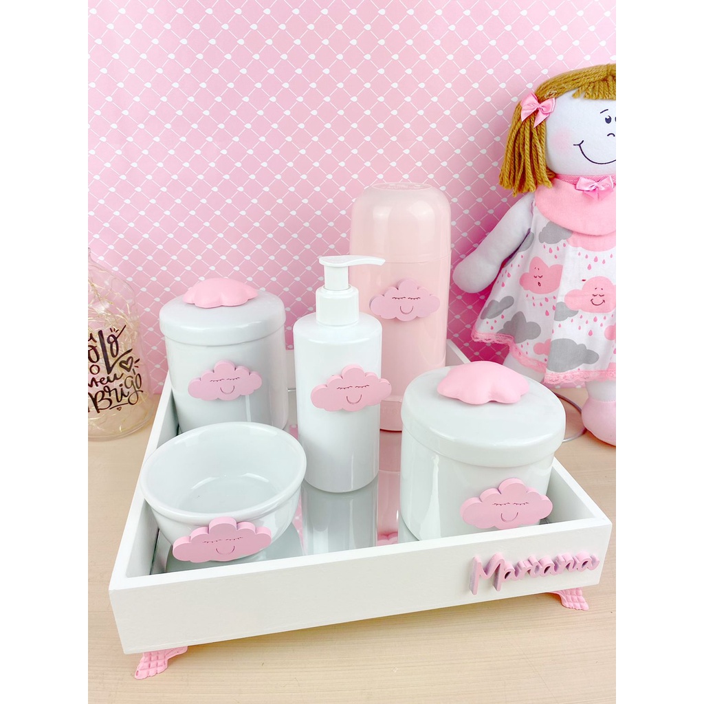 Kit Higiene Bebê Porcelana Temas Rosa Nome Personalizado bandeja coração pinus