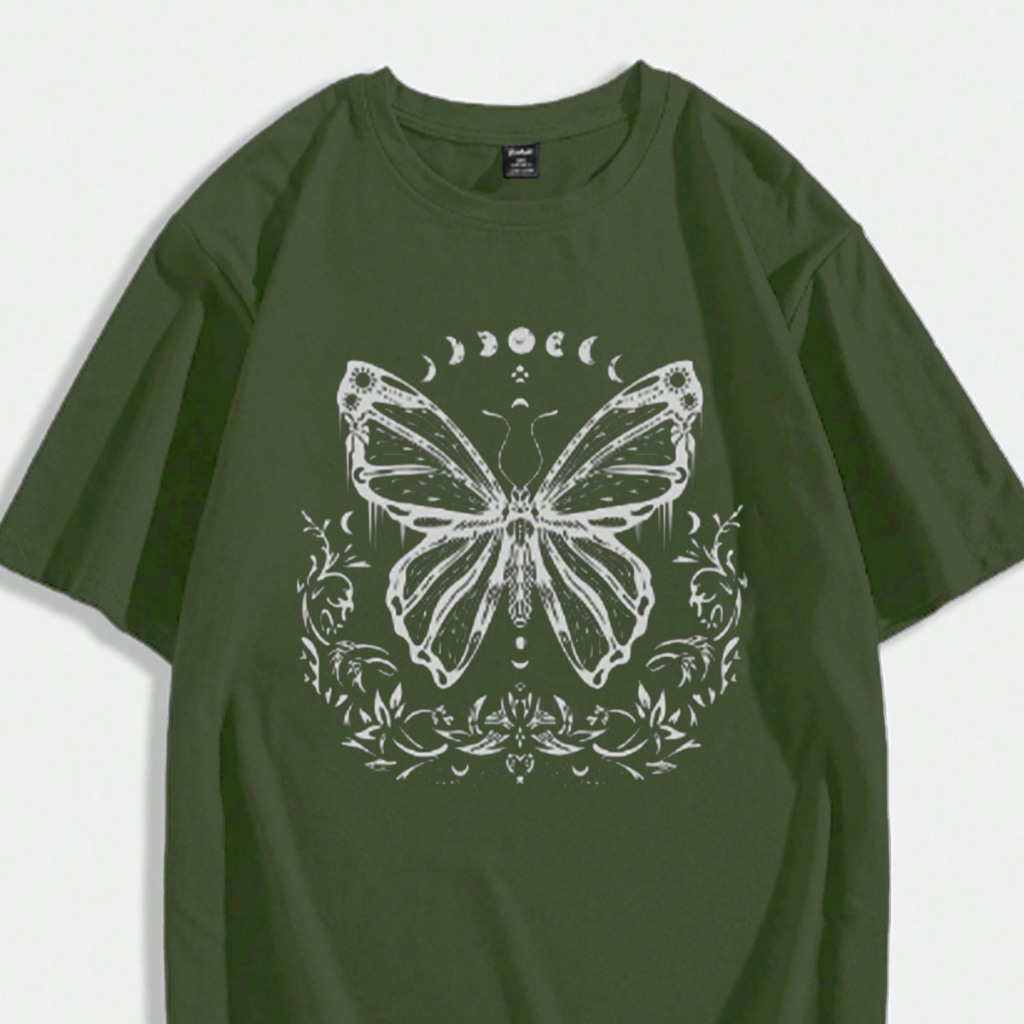 Camiseta Oversized Feminina Plus Size Manga Curta Minimalista Blusa Streetwear Unissex Tecido Macio Confortavel Estampada Desenho Borboleta Fases Lua Céu