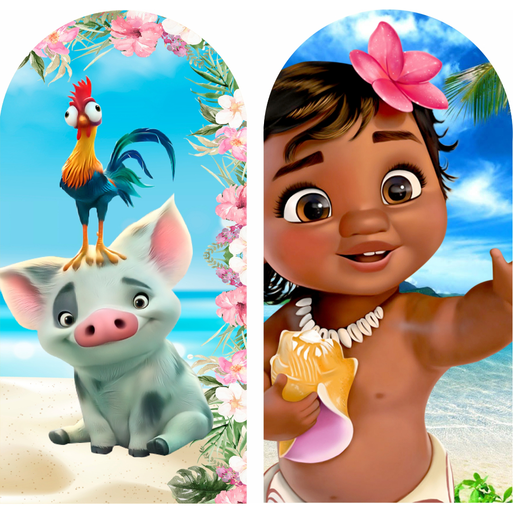 KIT PAINEL DE FESTA MOANA CUTE BABY + BICHINHOS + BARCO - 2 PAINEIS ROMANOS 2,00M DE ALT X 1,00M DE LARG