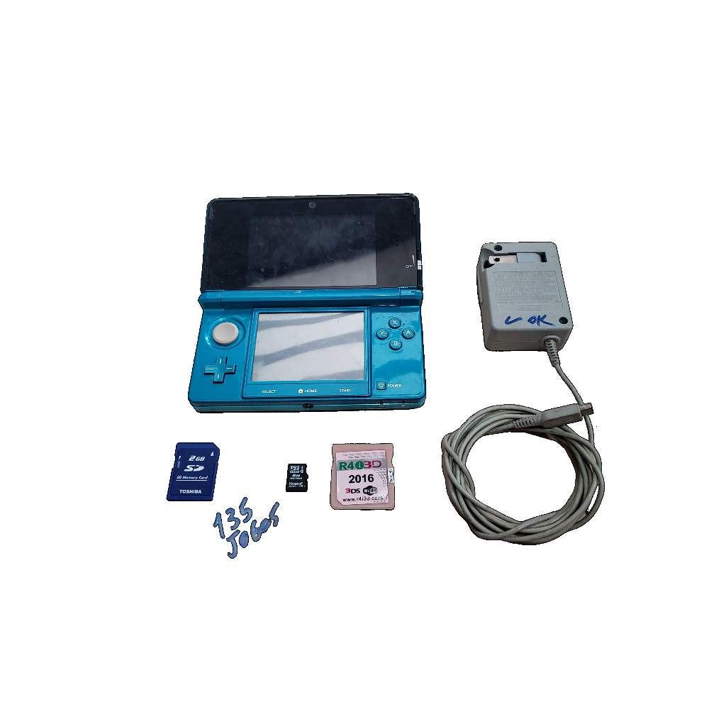 Nintendo 3DS original desbloqueado com jogos no cartão de memória e carregador original