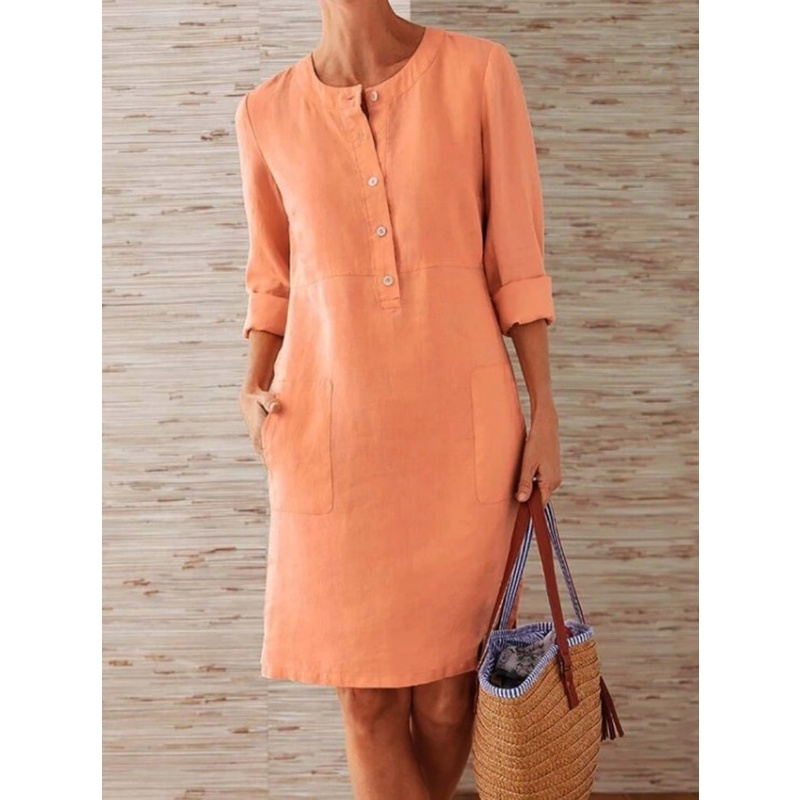 Vestido De Moda Feminina Casual Pancil Linho De Algodão Gola Redonda Manga Longa Vestidos De Bolso Feminino Roupa De Rua