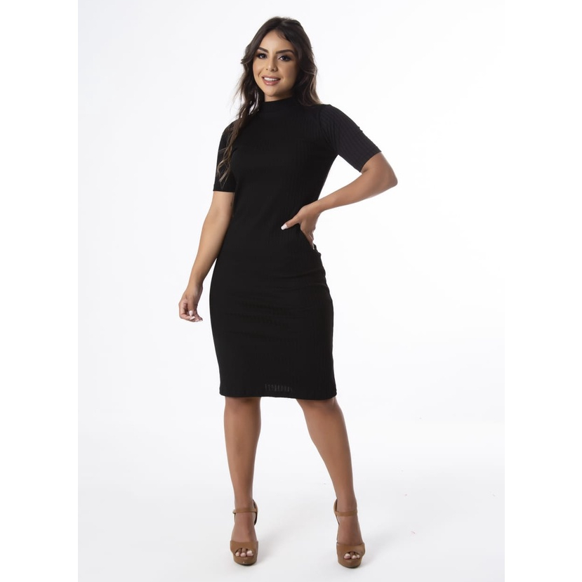 Vestido Canelado Feminino Midi Gola Alta Malha Canelada