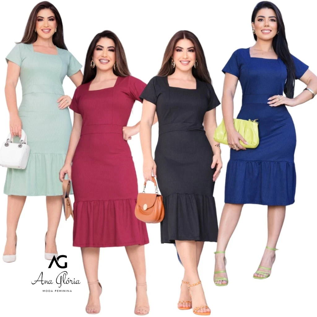 Vestido Feminino Mídi Manga Curta Tendencia Malha Canelada forrada Moda Social Evangélica Plus Size
