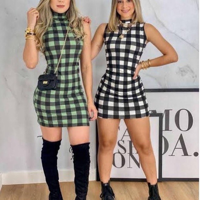 Vestido manga cavada malha canelada gola alta xadrez curto feminino