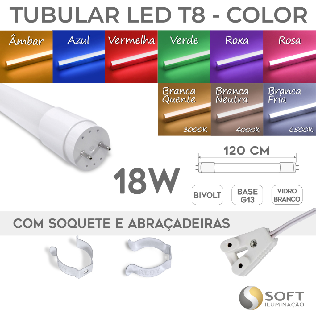 Kit 3 5 10 Lâmpadas Tubular LED T8 CORES 18W / 120cm Bivolt Base Bipino G13 Tubo + Soquete e Abraçadeira