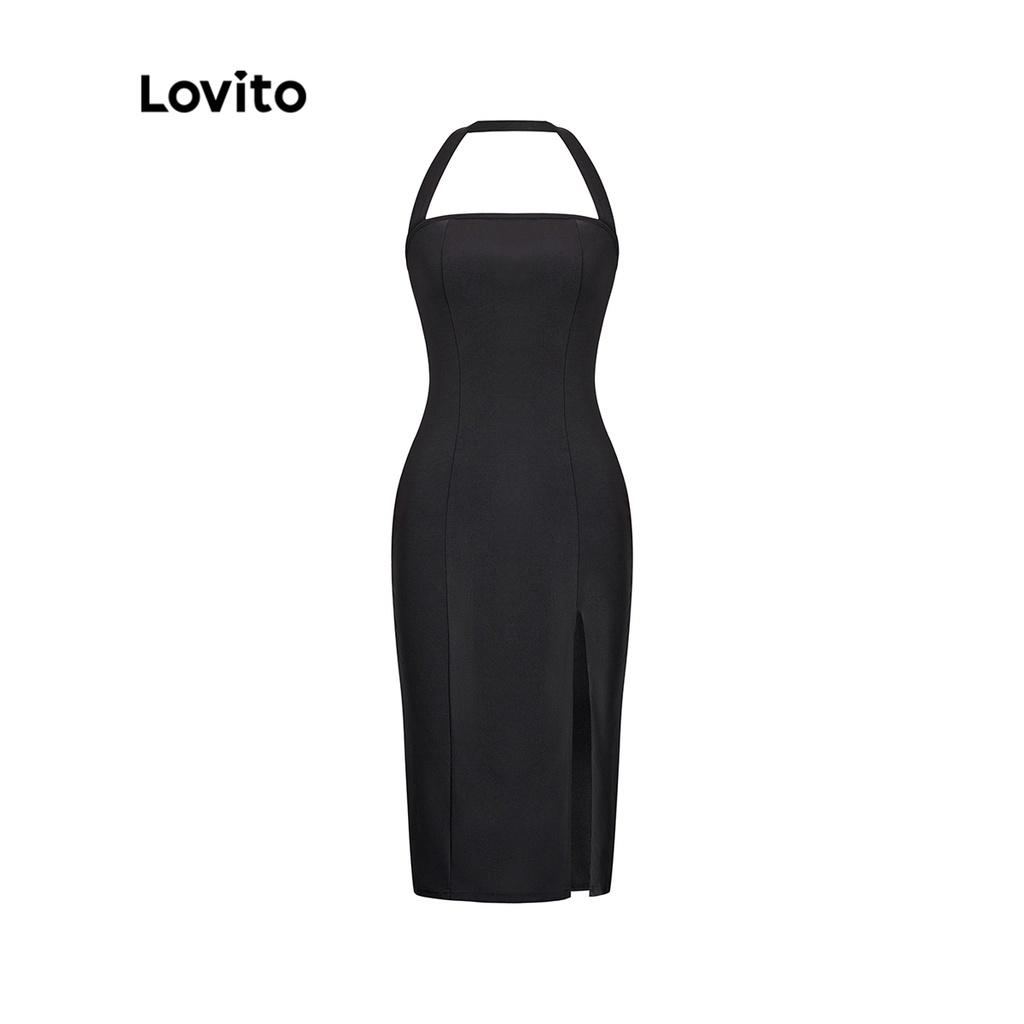Lovito Casual Vestido Feminino Liso Sem Mangas Midi com Fenda Frontal e Gola Quadrada LNE02204 (Preto)