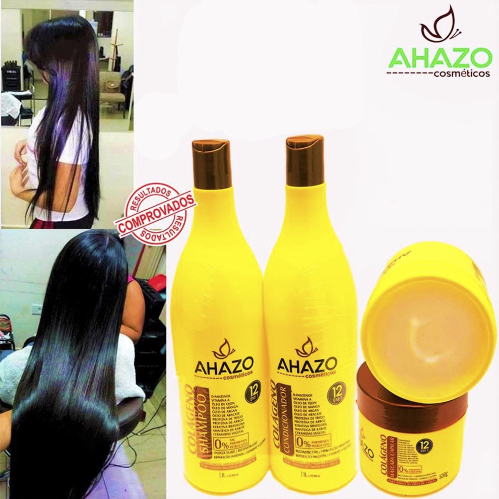 Kit colágeno 12 em 1 da AHAZO. Tratamento com shampoo, condicionador e máscara de hidratação.