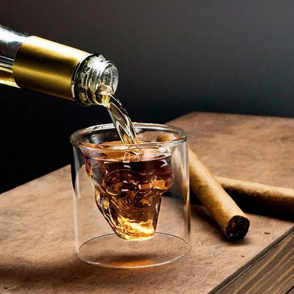 Conjunto com 2 Copos Skull Café Whisky Vidro Parede Dupla Caveira 154ml Lyor Original Decoração Dark Borossilicato Luxo Festa Presente Caveira de vidro