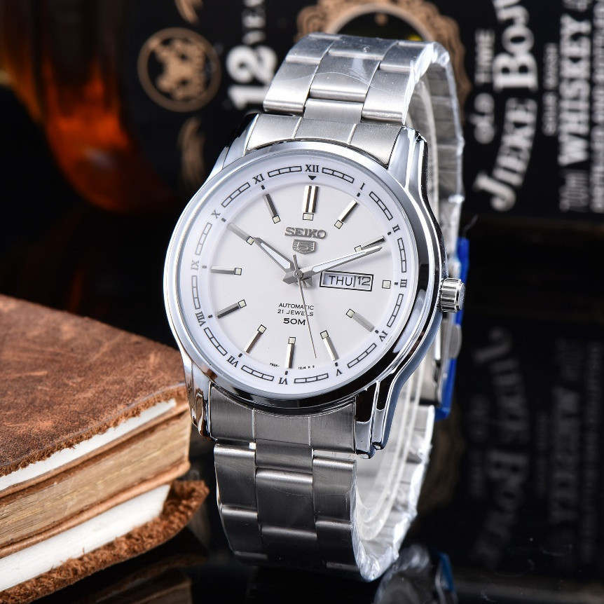 SEIKO ya Classic SEIKO5 Series Voltar Transparente Enrolamento Automático Disco Branco Movimento Mecânico Pulseira De Aç