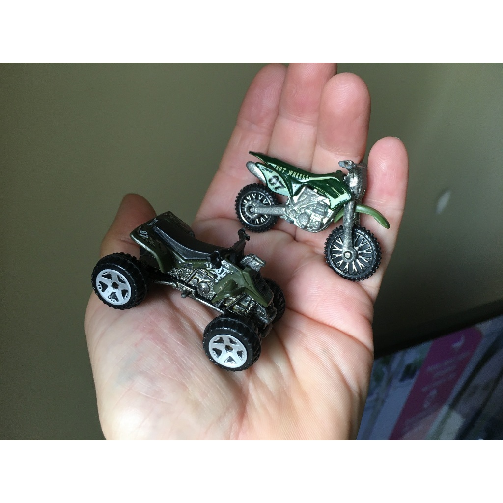 motocicleta tipo quadriciclo verde militar e Motocross Cross da Hot Wheels de metal