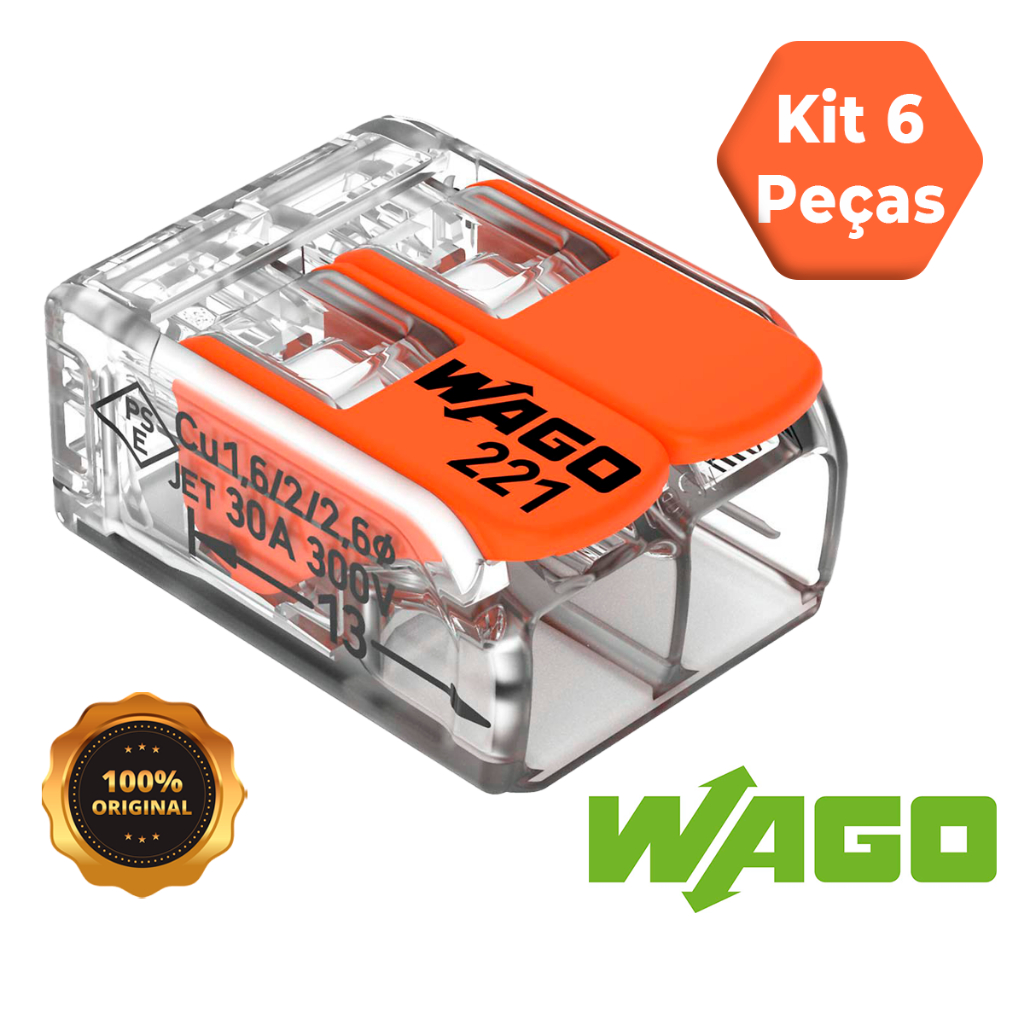 Kit 6 Peças Conector Wago Original 221-612 Emenda Chuveiro 2 polos 6mm 41A Conexão Automática