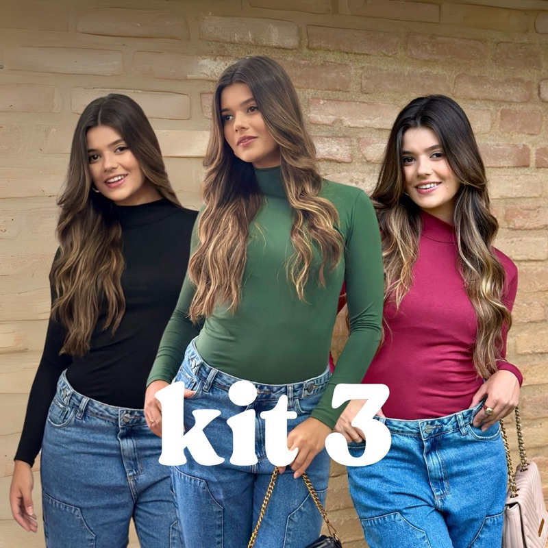 Kit 3 Blusa Feminina Manga Longa Gola Alta Canelada Até Gg