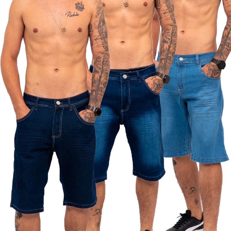 Kit 3 bermudas Jeans com lycra Masculinas Tamanhos NORMAL E PLUS SIZE PREMIUM