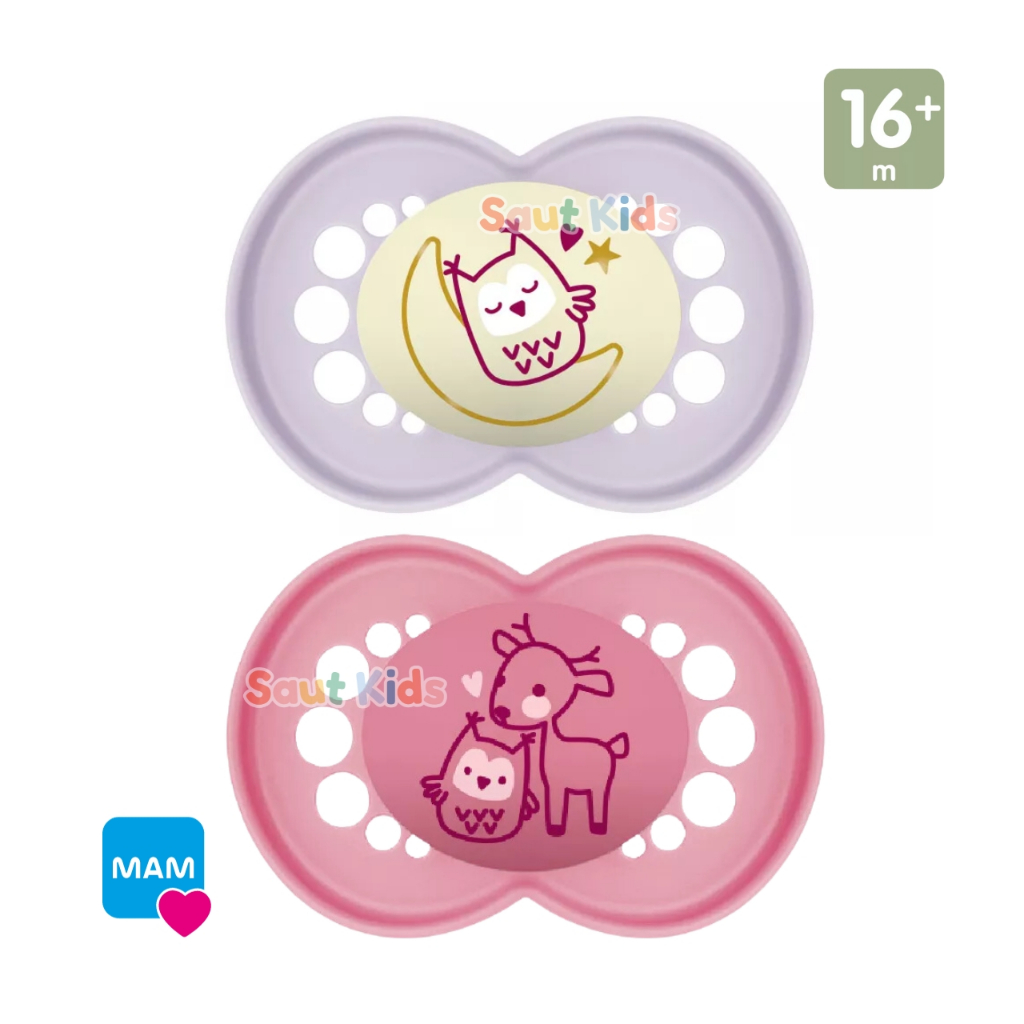 2 Chupeta MAM 16+ Meses MAM Original DAY&NIGHT 1 brilha no Escuro Menina Bebê Bico Silicone Rosa
