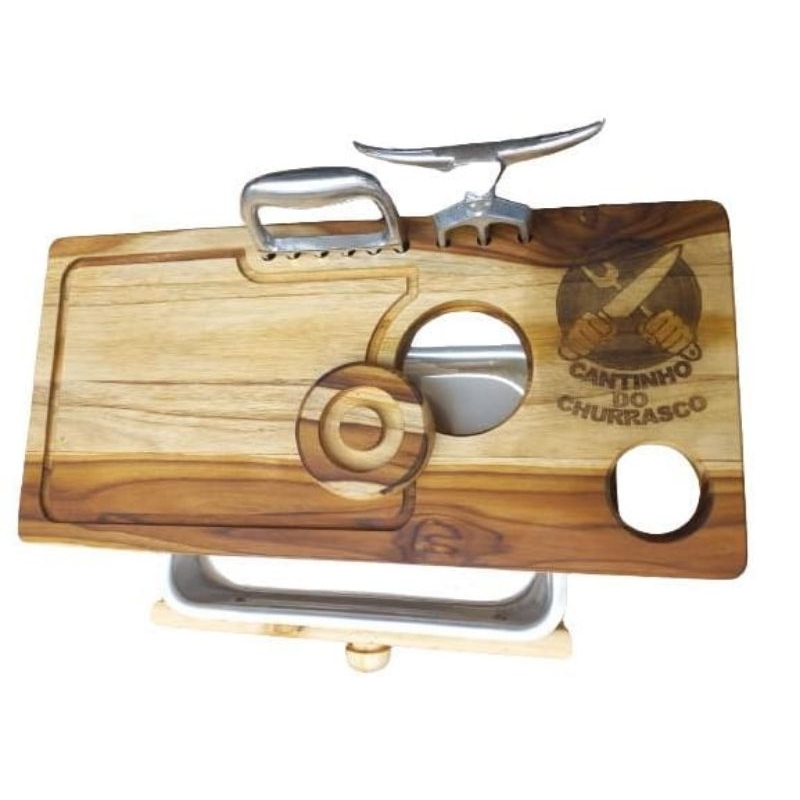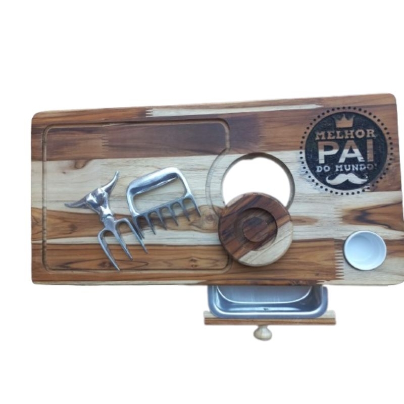 TABUA DE CHURRASCO COM GAVETA COMPACTA ACOMPANHA GARRA E TRIDENTE E NOME PERSONALIZADO DE BRINDE